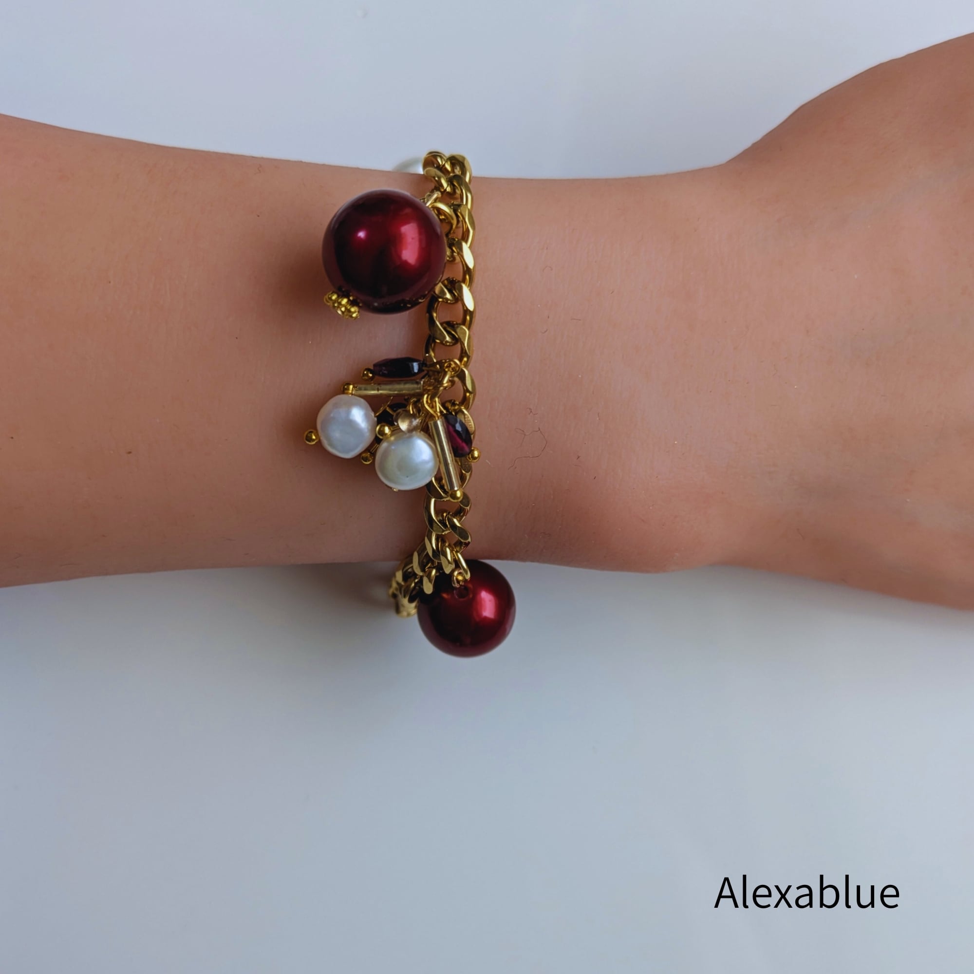 ブレスレットは優しく輝くレッドパールと淡水パールを組み合わせ、
