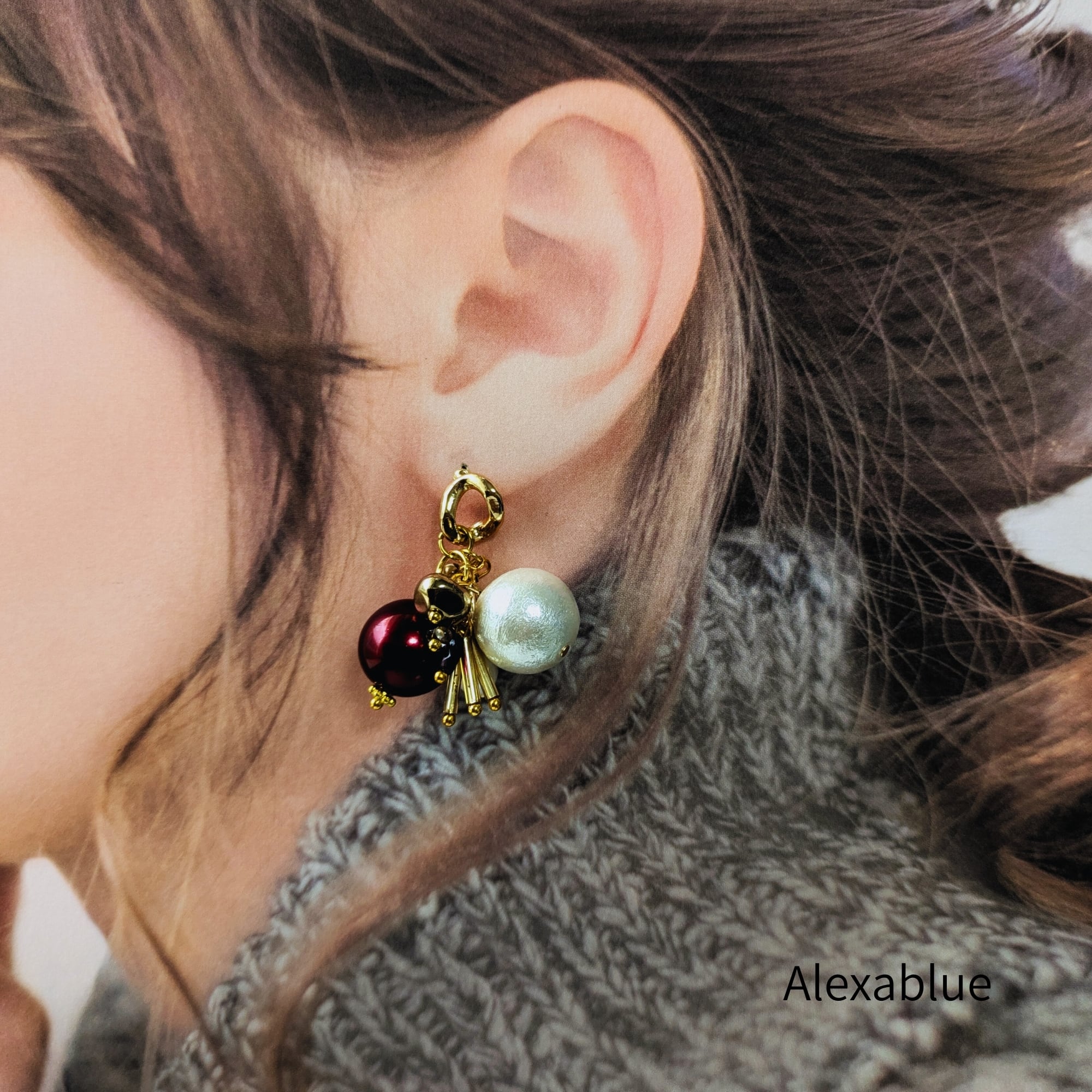 ピアスにはガーネット・コットンパール・淡水パールをバランスよく配置。