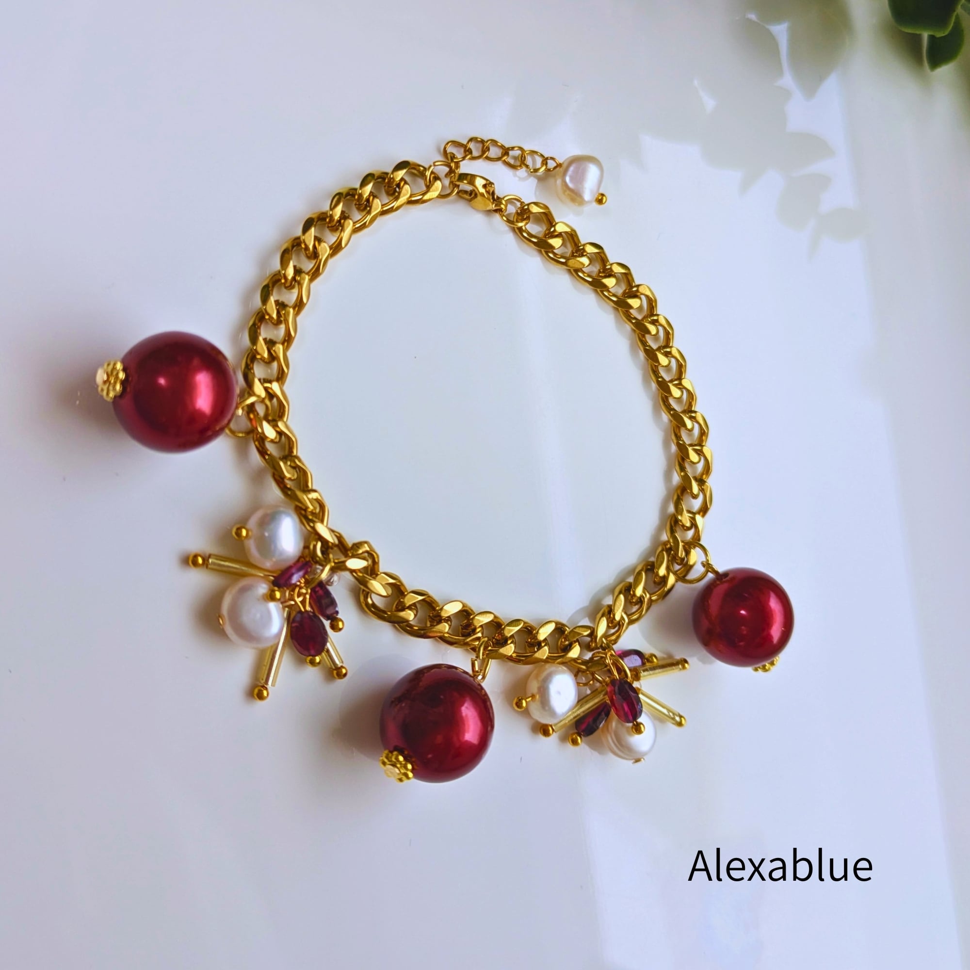 ガーネット × 淡水パール クリスマスジュエリーセット|レッドパールのブレスレット&大ぶりピアス〈大人華やかパーティアクセ〉