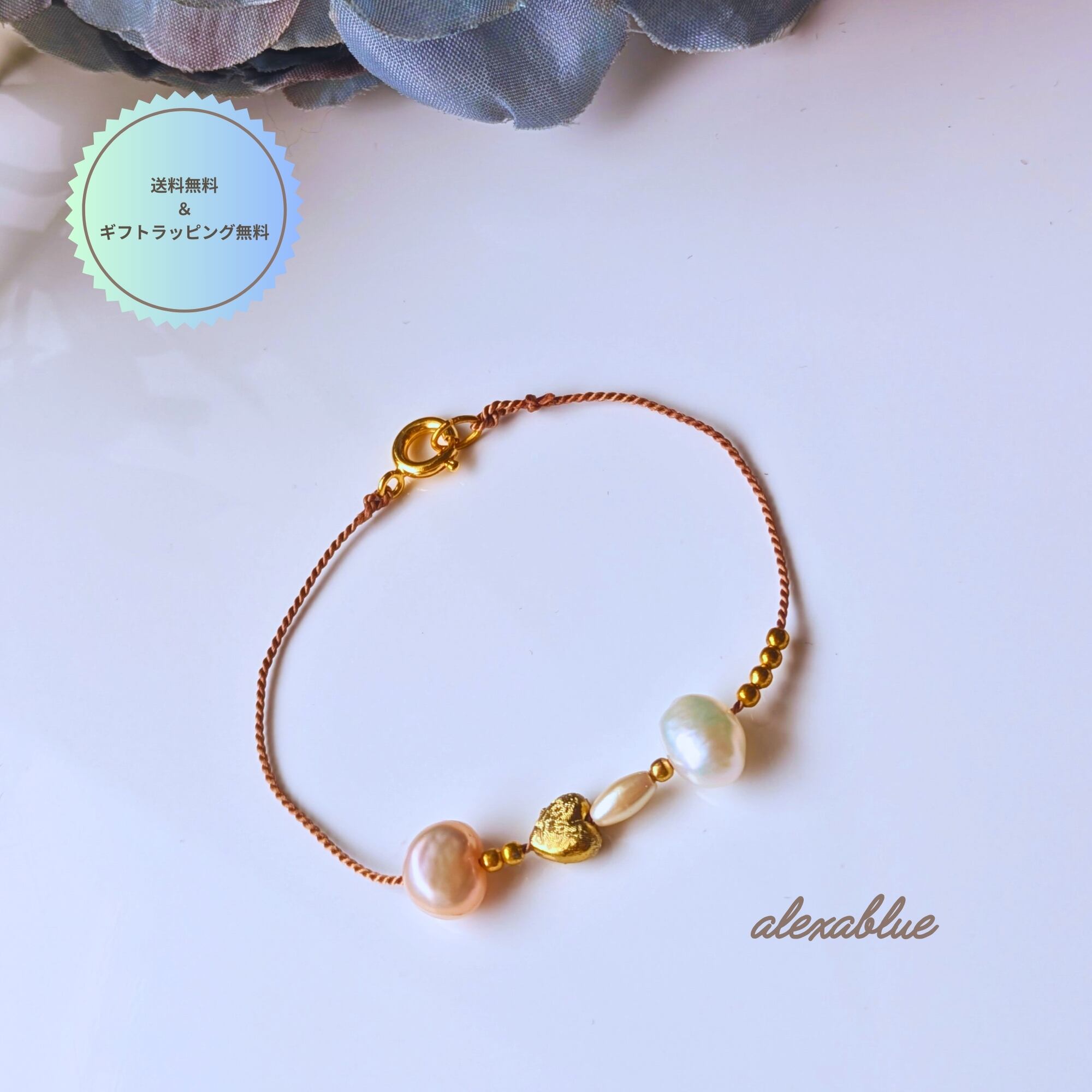 ゴールドハート&パール シルクコード ブレスレット|華奢で大人可愛い|送料無料 |無料ラッピング対応