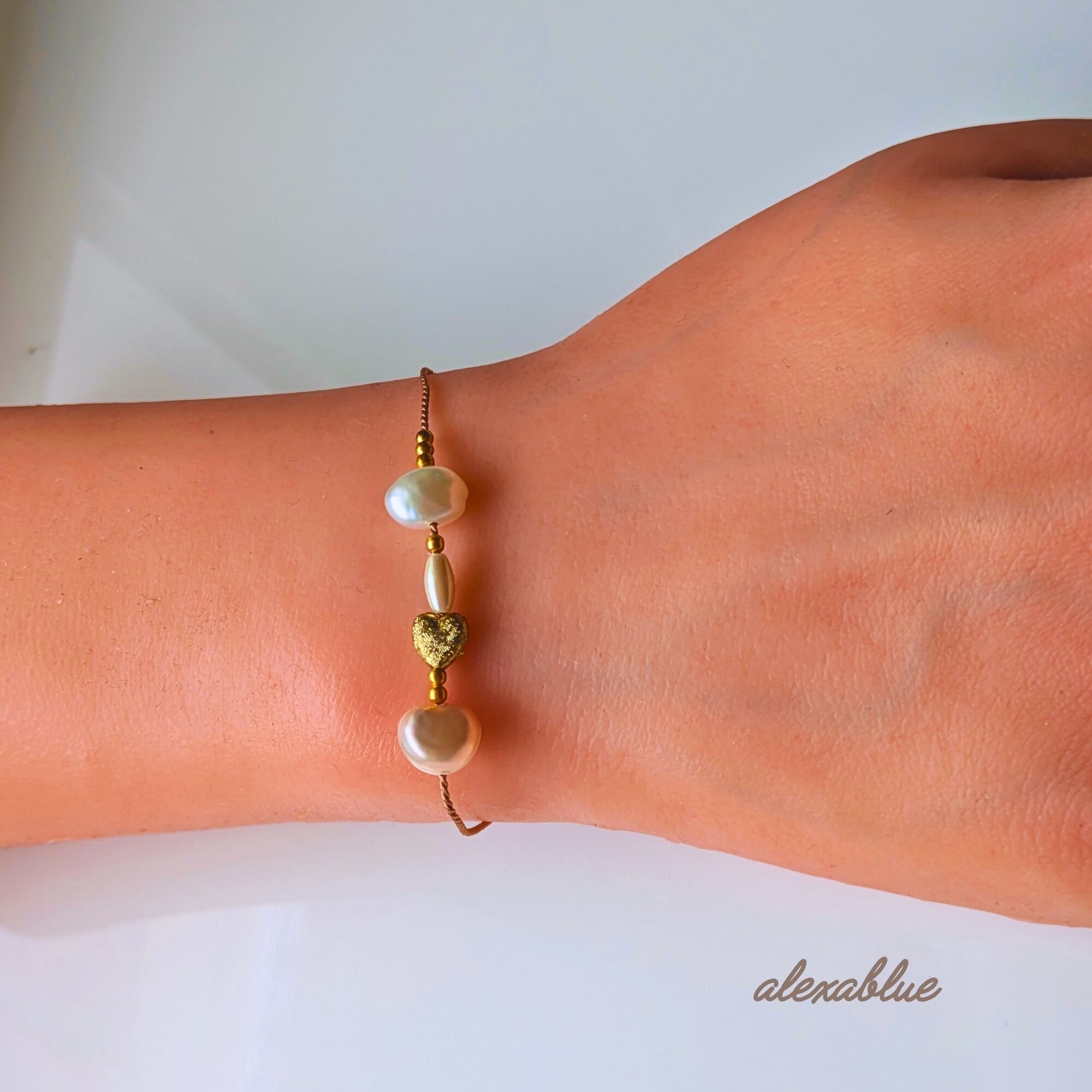 小さなパールとゴールドハートを組み合わせた、華奢で大人可愛いシルクコードブレスレットです。