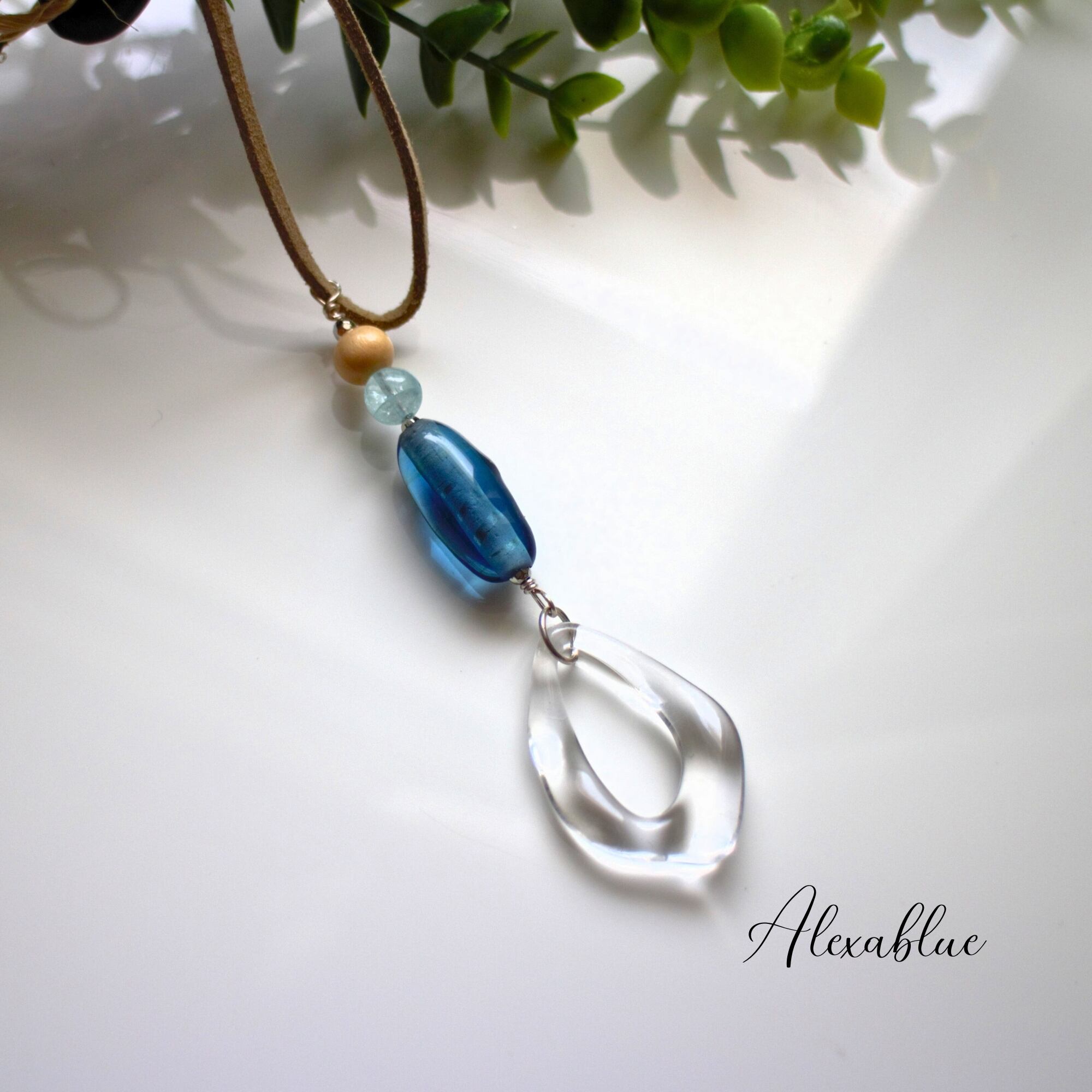 アクアマリンとダークブルーが綺麗なガラスを合わせ製作したおしゃれなCarミラーハンギングです。