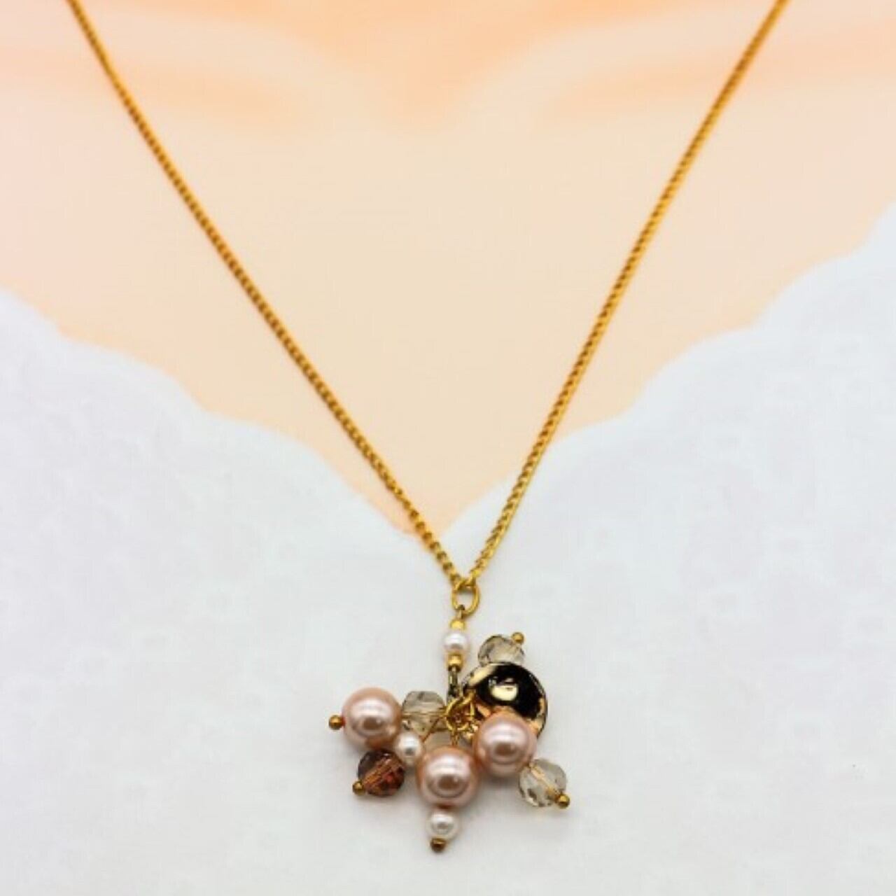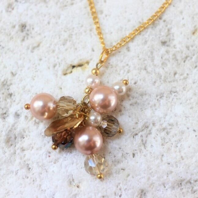 素材:スモーキーピンクパール、ホワイトパール、スワロフスキービーズ、ゴールドモチーフ、GPネックレス